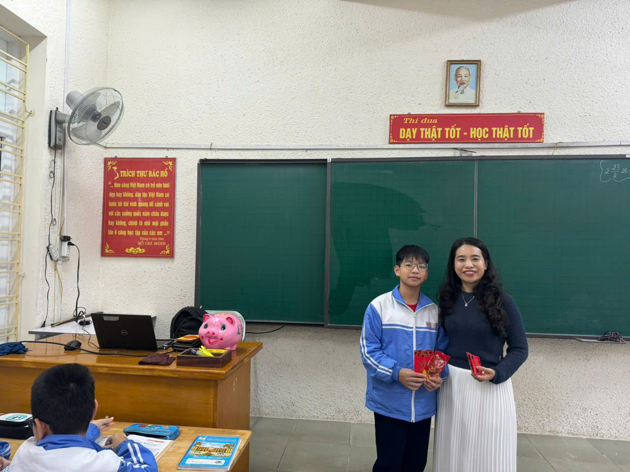 Đặc biệt, trong không khí trang trọng và thân tình ấy, Ban Giám hiệu nhà trường đã trực tiếp đến từng lớp học để chúc Tết thầy cô và các em học sinh. Những lời chúc đầu xuân giản dị mà sâu sắc được gửi gắm, chúc các em chăm ngoan, học giỏi, chúc tập thể lớp luôn đoàn kết, nỗ lực và đạt nhiều thành tích cao. Hình ảnh thầy cô trong Ban Giám hiệu bắt tay, trò chuyện và động viên từng lớp đã tạo nên một dấu ấn đẹp trong ngày trở lại trường. Không chỉ dừng lại ở những lời chúc, Ban Giám hiệu còn nhấn mạnh tinh thần “Khởi đầu mới - quyết tâm mới”, mong muốn mỗi học sinh xác định rõ mục tiêu học tập, rèn luyện ý thức kỷ luật, xây dựng môi trường học đường thân thiện, tích cực. Sự quan tâm sát sao ấy đã tiếp thêm động lực để các em bước vào những tiết học đầu tiên của năm mới với tâm thế phấn khởi và nghiêm túc.